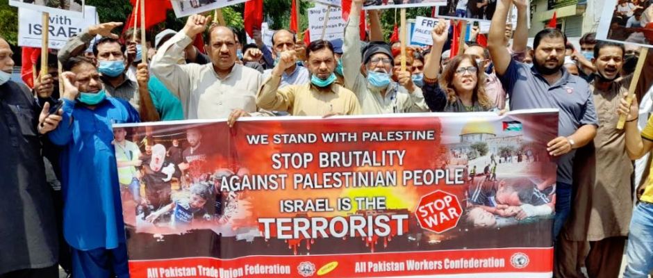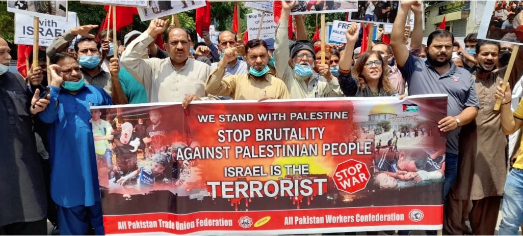 All Pakistan Trade Union Federation hold a protest rally against israel brutal attack on palestinian people and children. « The working class stand with palestinian people. We want free Palestine ۔ Israel barbaric attack on Palestine is violation of human right charter ».