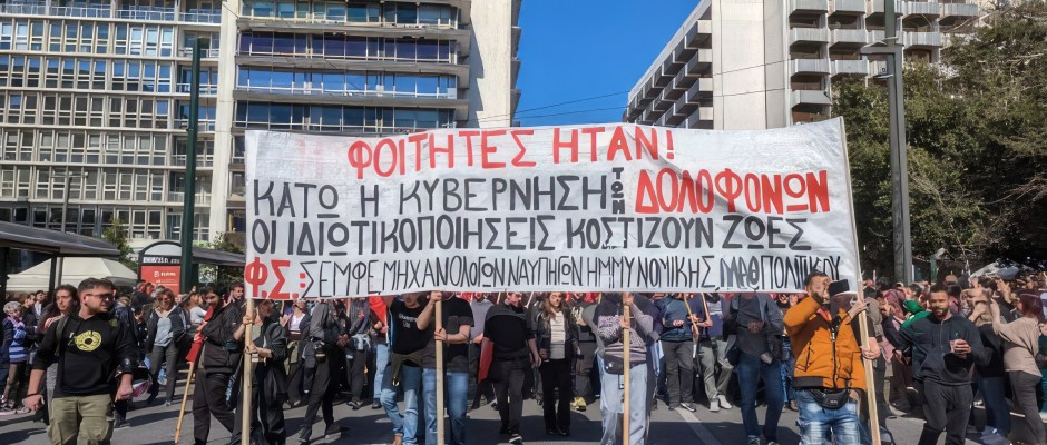 “Call me when you get there”: this has become the iconic phrase of the revolt that has erupted since the February 28 train accident that claimed the lives of fifty-seven passengers, mainly students. 65,000 workers and youth demonstrated on 8 March throughout Greece. In Athens, Syntagma Square, just in front of the Parliament, echoed the 2010-2011 demonstrations against the Troika’s (IMF-European Commission- European Central Bank) austerity programme.