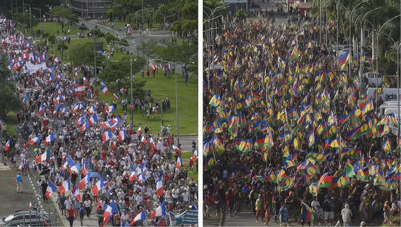 On April 13, two demonstrations were held in Nouméa, each bringing together some 15,000 participants (representing over 10% of the island’s population). On one side, the settlers, decked out in tricolours and chanting « On est chez nous » (« This is our home« … 17,000 kilometers from Paris!), reminiscent of the « ultras » of « French Algeria ». On the other, in their thousands, the Kanak people and their political organizations and trade unions – as well as Melanesians and Europeans – demonstrated against the State’s « passage en force », brandishing the blue-red-green-yellow flag of national independence.